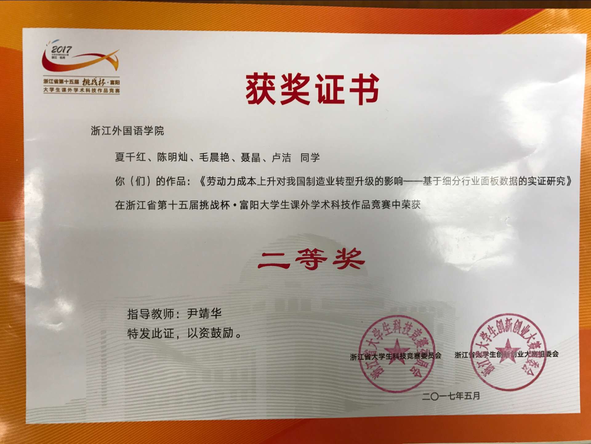 5月19日-21日,浙江省第十五届“挑战杯·富阳”大学生课外学术科技作品竞赛决赛在浙江工业大学举行。经过激烈角逐,由我校尹靖华老师指导,国际商学院夏千红、陈明灿、毛晨艳、聂晶和卢洁五位同学组成学生学术团队的作品《劳动力成本上升对我国制造业转型升级的影响——基于细分行业面板数据的实证研究》荣获二等奖,展现了浙外学子博学、善于研究的精神风貌。