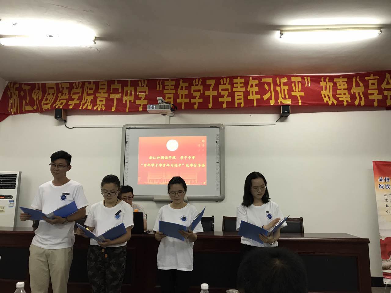 7月3日晚,商学院赴畲乡景宁“追寻习近平总书记浙江足迹”学习教育实践小分队于浙江省景宁中学开展“青年学子学习习近平”故事分享会。校党委副书记赵伐,景宁团县委书记刘红,景宁县教育局副局长、景宁中学校长陈战耕等领导出席故事分享会并致辞。云和团县委书记鲍燕,景宁中学党总支书记金利兵,校团委书记傅尧力,商学院党总支副书记周明宝,追寻习近平总书记浙江足迹暑期社会实践队全体师生、景宁中学100余名高二学生参加分享会。