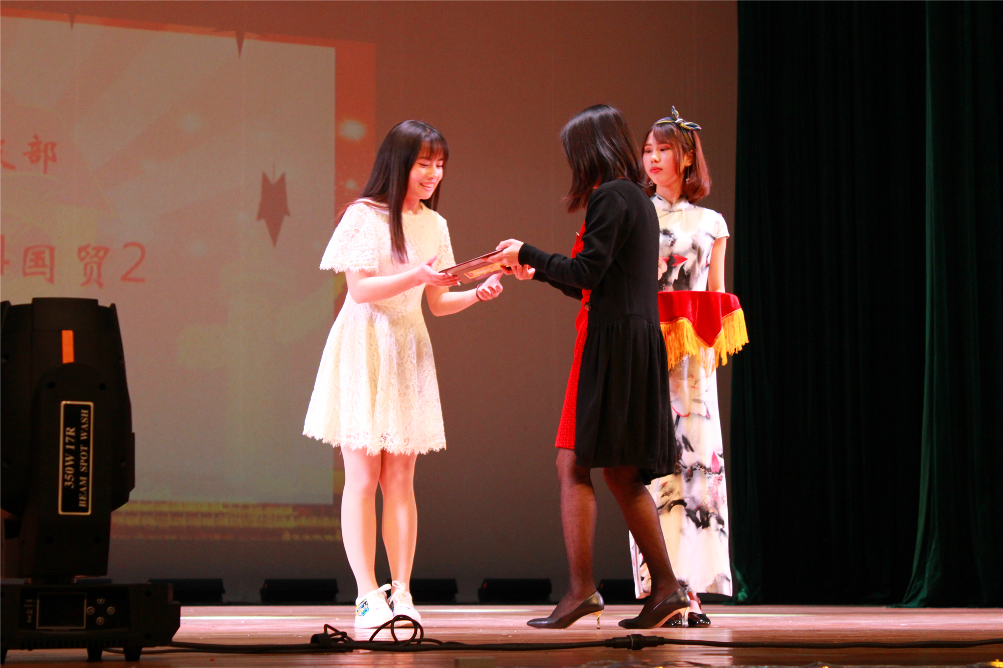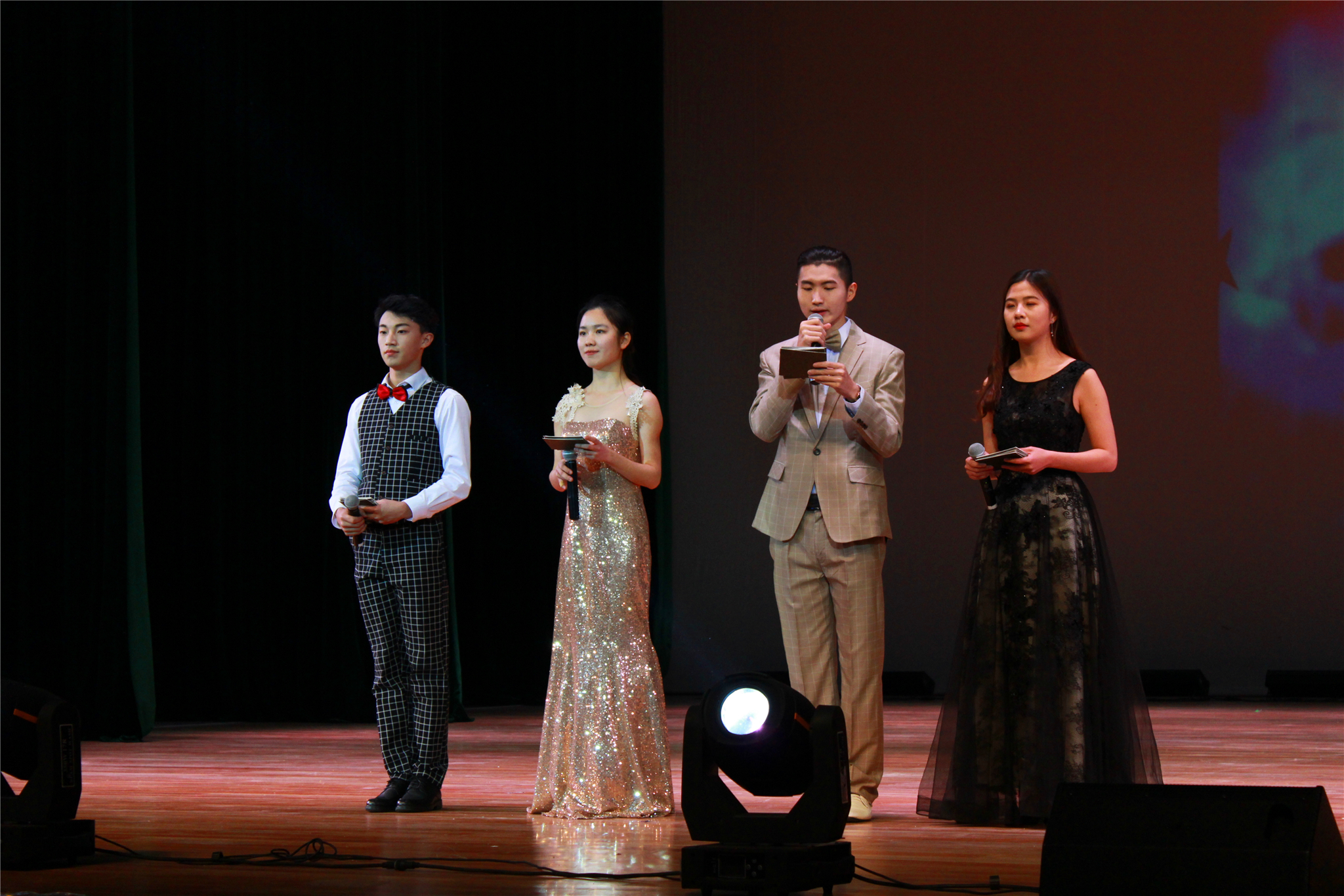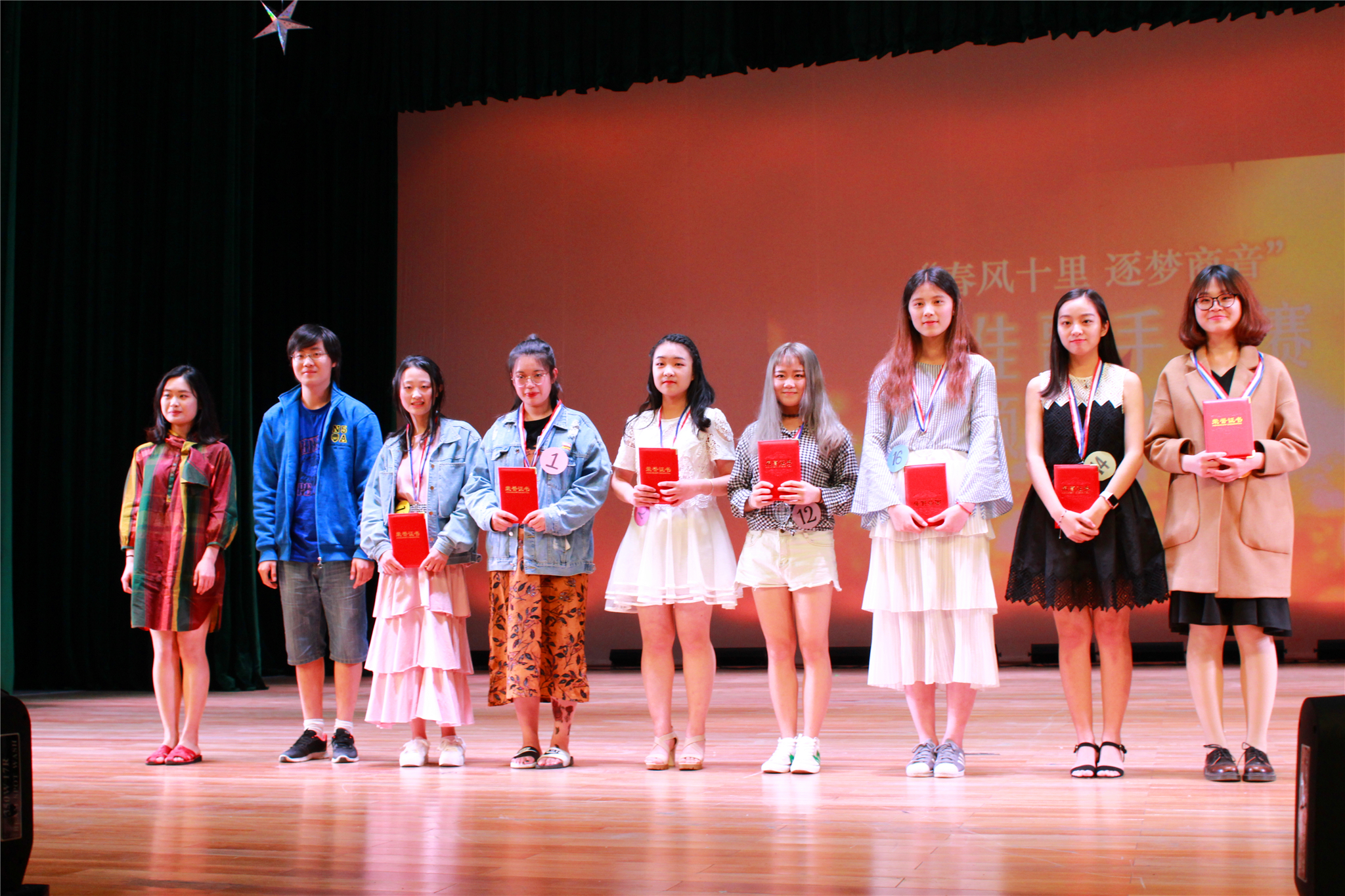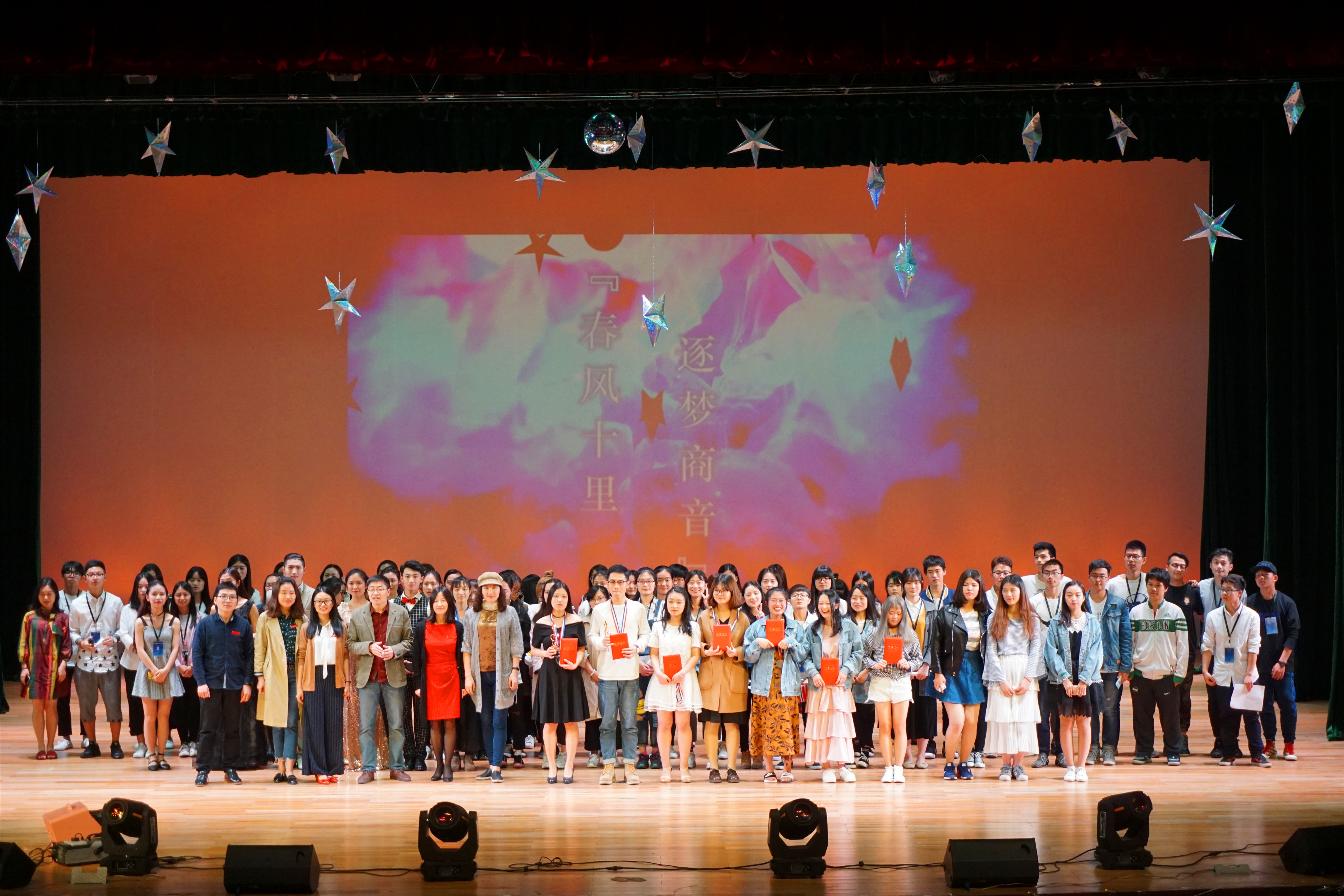 为更好地发挥优秀青年的榜样作用,展现当代大学生青春风采,4月27日晚18:00,备受关注的2017校园歌手大赛决赛暨“五四”青年节青春榜样颁奖晚会在追梦堂隆重举行。本次晚会由院学生会主办,院团委协办。美国波士顿大学音乐学院和新英格兰音乐学院声乐和合唱指挥双专业访问学者、艺术学院声乐指导老师周娟娟,艺术学院声乐艺术指导老师杨凯超,一二九大合唱最佳指挥林李亚学姐担任此次决赛评委。校宣传部杨秀中老师,校团委黄官飞老师。院党总支书记叶丽红,院工会主席、办公室主任钱伟以及各辅导员受邀参加。