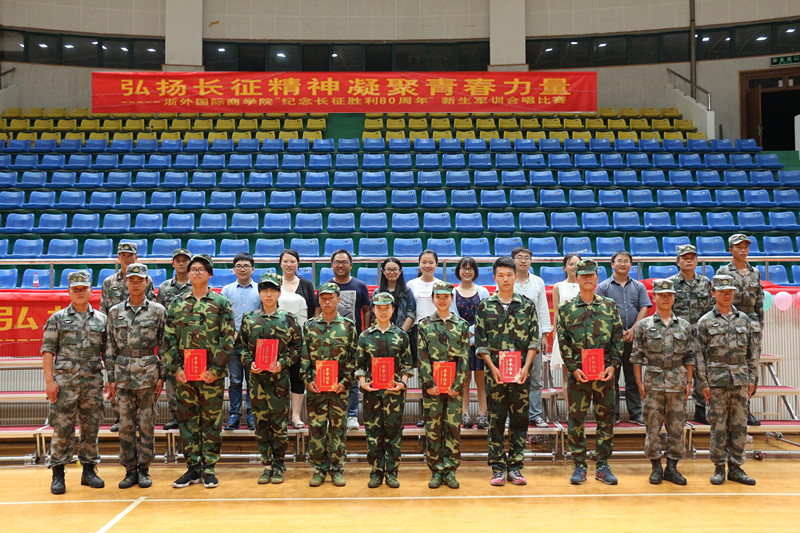 为积极响应习近平总书记“缅怀先烈、不忘初心,走好新的长征路”的号召,唱响红歌军歌校歌,弘扬长征精神,致敬祖国大学青春,展现学子风采,9月28日下午6点30分,浙江外国语学院国际商学院"纪念长征胜利80周年"新生军训合唱比赛于体育馆热烈举行。院党总支副书记周明宝,院学工办主任梁汲媛,校党委宣传部樊朝刚老师,校党委学工部吴佩玲老师及全体辅导员作为评委出席此次比赛。
