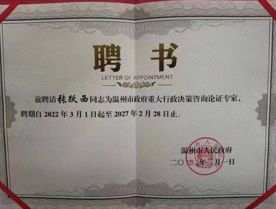 澳门六合彩跑狗图 张跃西教授获聘温州市政府重大行政决策咨询论证专家