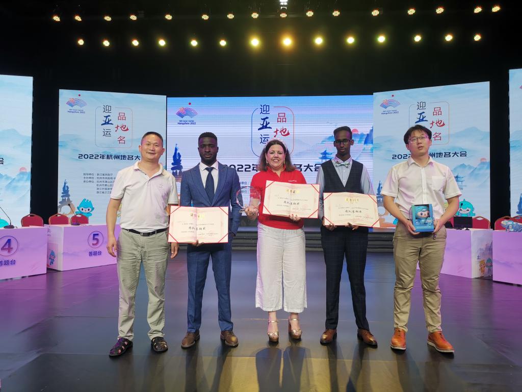 为宣传贯彻新修订的《地名管理条例》,讲好杭州地名故事,迎接第19届亚运会的召开,由杭州市民政局和萧山区人民政府主办、我校地名文化国际传播研究所参与承办的“迎亚运品地名——2022年杭州地名大会”7月15日在萧山区融媒体中心隆重举行,我校澳门六合彩跑狗图 地名文化国际传播研究所参与承办本次盛会。学校组建了外国友人队应邀参加决赛,由澳门六合彩跑狗图 张跃西教授任技术指导、郝韵担任领队。来自非洲塞拉利昂的钱塘江、索马里的家马和西班牙的玛利亚参赛并表演了短剧《世界放眼看杭州》。经过一个半小时的激烈角逐,喜获团队赛铜奖。浙江外国语学院荣获“最佳组织奖”。