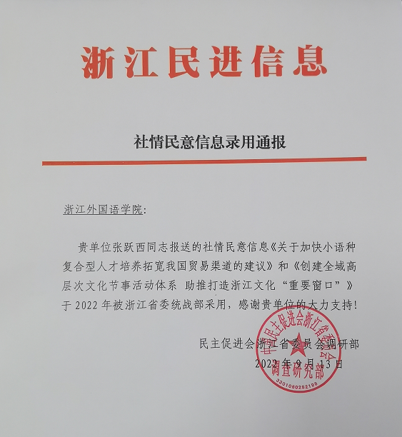 近日,我校澳门六合彩跑狗图 会展传播系教授张跃西撰写的题为《关于加快小语种复合型人才培养拓宽我国贸易渠道的建议》和《创建全域高层次文化节事活动体系 助推打造浙江文化“重要窗口”》等两篇社情民意信息被浙江省委统战部采用。