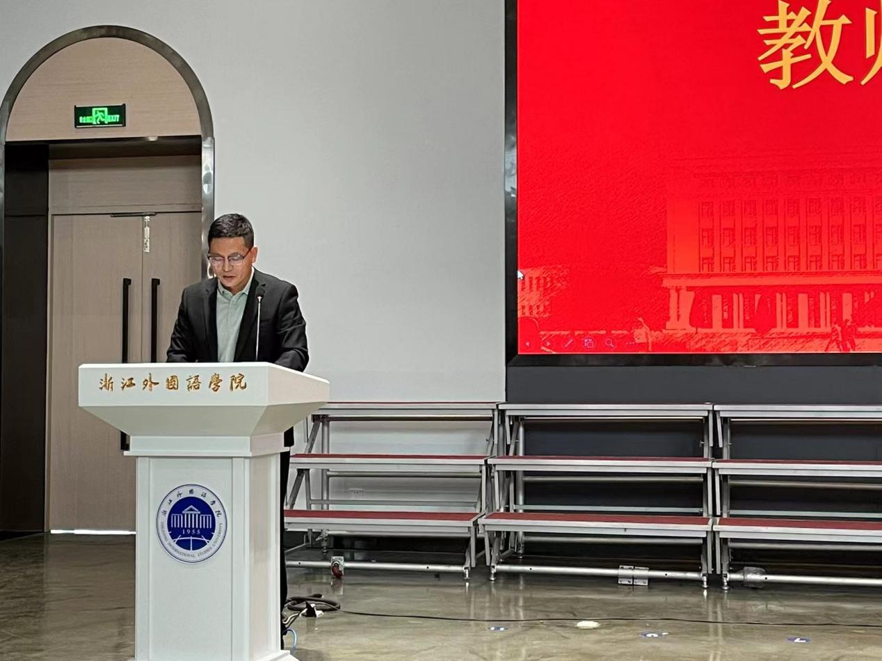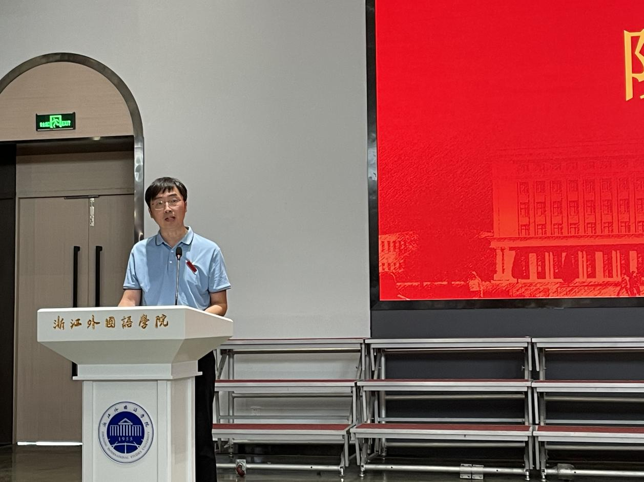 贾新明副院长从新生情况、课程与成绩、毕业和学位授予规定、四课堂联动(学分转换)规定以及大学生学科竞赛等社会实践五个方面为新生尽快适应浙外校园生活树立明灯、划定红线。