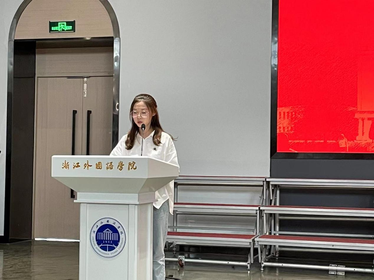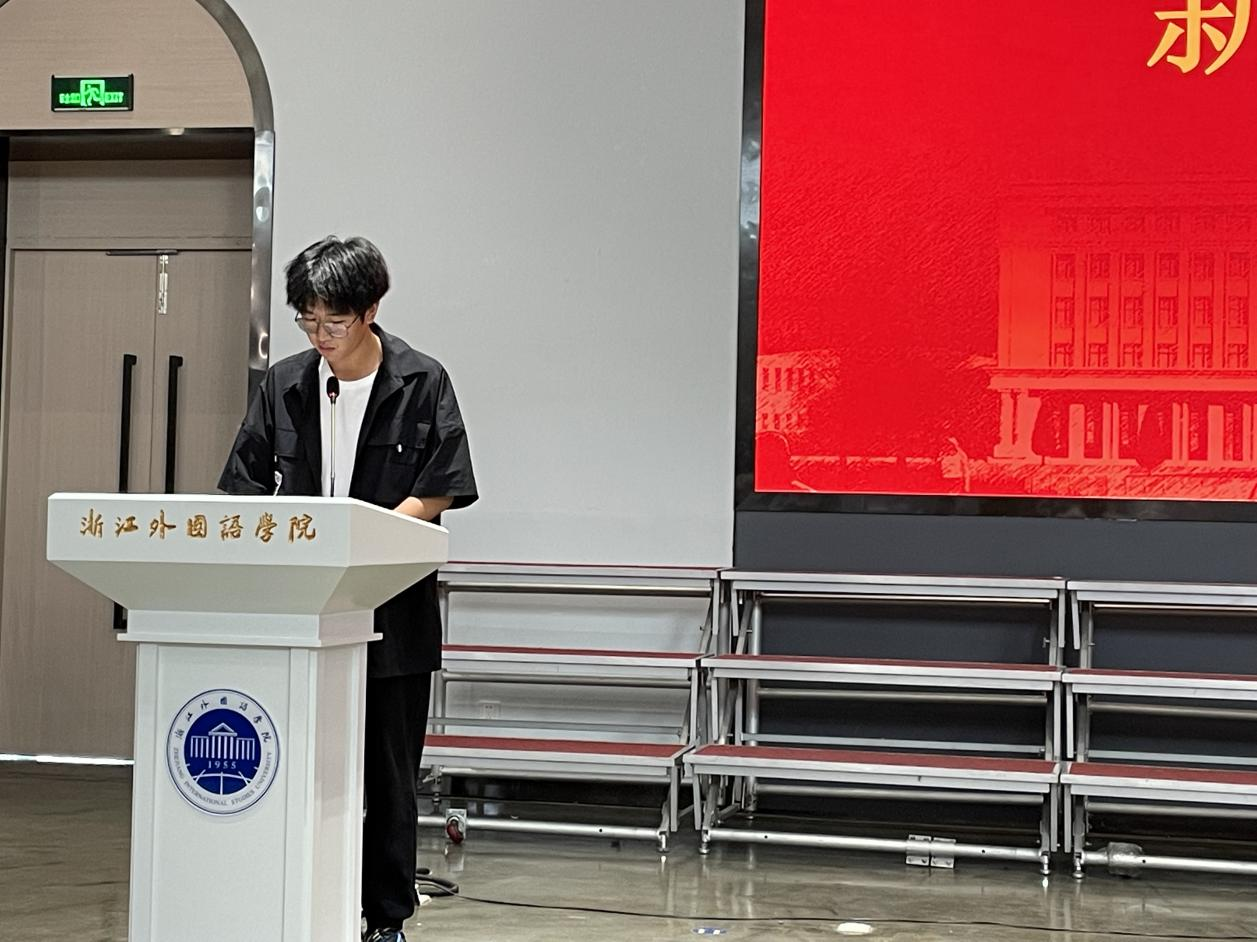 新生代表22旅管4班周祺航代表新生表达对老师学长学姐帮助的感谢,并决心在浙外的生活中勤学善思,做拼搏进取的文旅人;事必躬亲,做知行合一的文旅人;拥抱未来,做朝气蓬勃的文旅人。