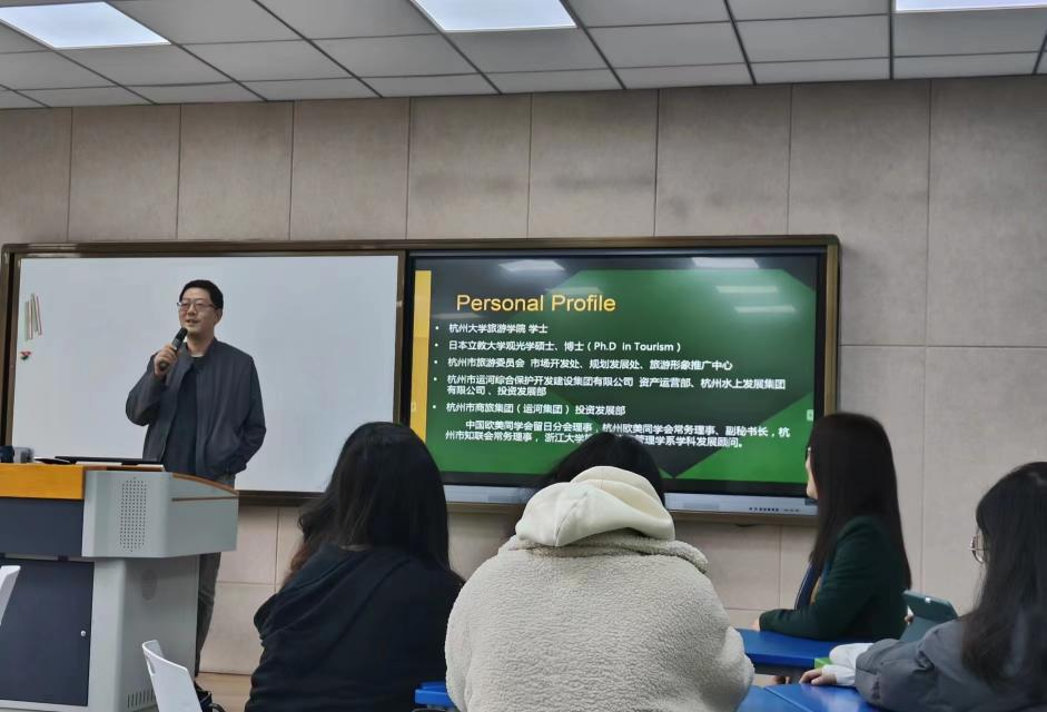 3月21日下午,杭州市商旅集团投资发展部负责人潘丹应蒋艳老师邀请,为选修《文化遗产与旅游(全英)》课程的同学们作了一场精彩的讲座。