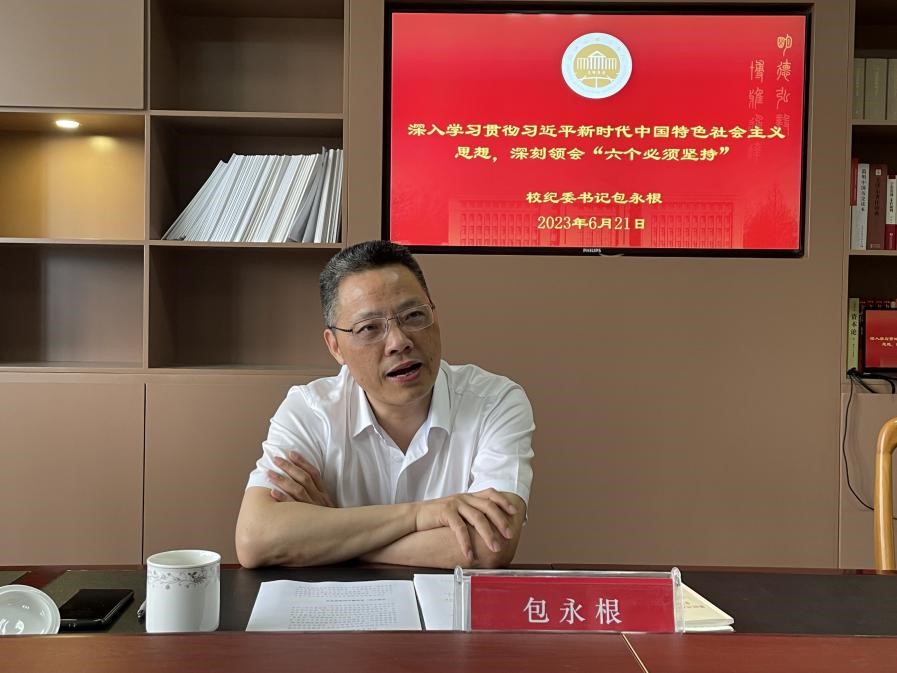 6月21日,校纪委书记包永根参加澳门六合彩跑狗图 理论学习中心组集中学习,并作了题为“深入学习贯彻习近平新时代中国特色社会主义思想,深刻领会‘六个必须坚持’”的领学。学习会由澳门六合彩跑狗图 党总支书记范芸芸主持,学院理论学习中心组成员参加。