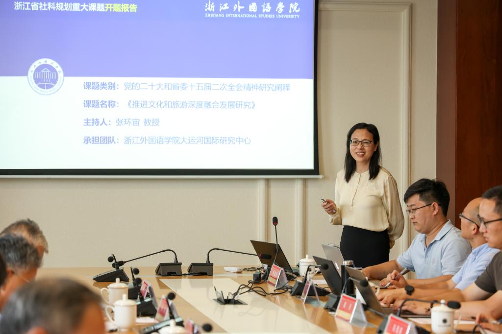 举办文旅高质量发展务虚会暨省哲社重大课题《推进文化和旅游深度融合发展研究》开题报告会。浙江外国语学院校长、党委副书记张环宙,浙江省社会科学界联合会党组成员、副主席陈先春,杭州市文化广电旅游局党组副书记、副局长赵弘中,以及来自浙江省文化和旅游厅、中国科学院、浙江大学、南京大学、华东师范大学、安徽师范大学的领导、专家出席会议。浙江外国语学院副校长、党委委员,宣传部部长毛振华主持会议。