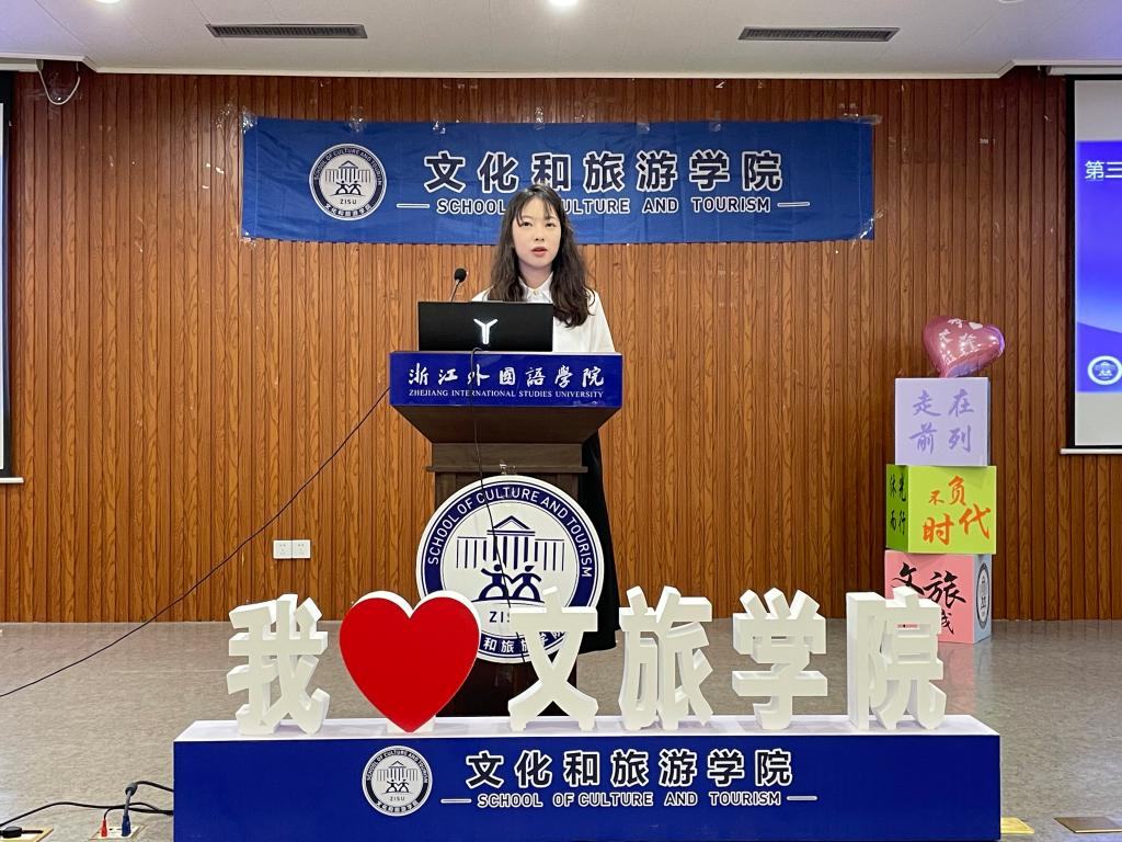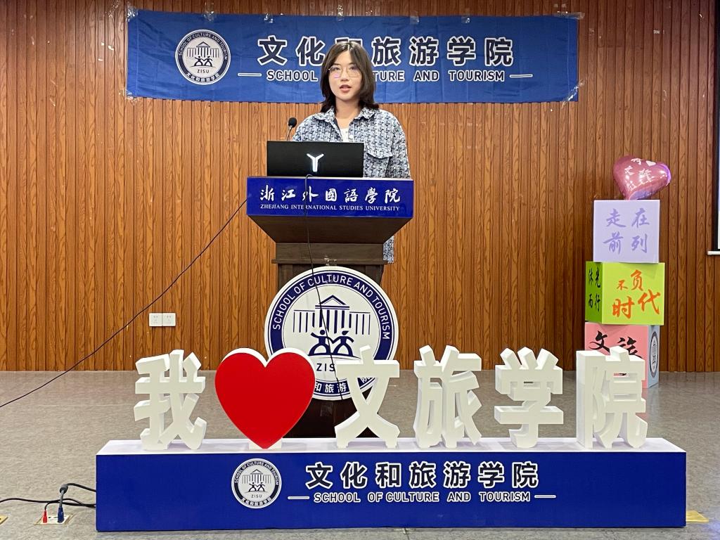 新生代表23旅管4班刘禹辰以自身的经历为铺垫,分享了她报考浙外的初衷与成长故事,表达了对旅游管理专业的理解与热爱。她表示愿和全体2023级文旅新生一起努力践行“青年学子学青年习近平”学习教育号召,不负大学时光,不负青春梦想。