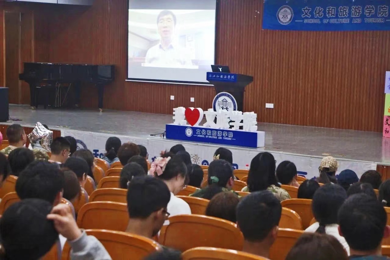 开学典礼在激昂雄壮的国歌声中拉开帷幕。执行院长张健康因工作原因以视频的形式向各位文旅学子表达欢迎和新学期的祝福,他在讲话中指出文旅产业在当今时代背景下具有蓬勃生命力,应该以更崭新的面貌去应对数字化的挑战,鼓励大家积极面对新的大学生活,努力奋斗。他深情寄语同学们,要充分利用学校的学习资源,用好大学宝贵的学习时光,完善自己、突破自己,实现自己的人生价值。