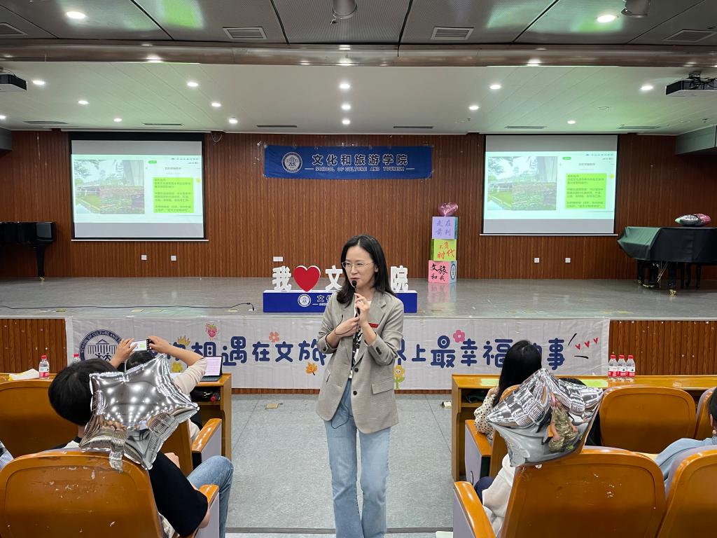 院长助理王敏娴向新生们介绍专业,指出旅游管理与会展经济与管理面临新的朝阳,在政府扶持与高度关注下,学科地位得到提升,期望在未来实现“处处能旅游,时时可旅游,行行加旅游,人人享旅游”的伟大愿望。此外,王敏娴老师从学院中观和微观层面对学院情况进行了整体介绍,指出坚持“四课堂”联动的连贯性,即“教学、校内拓展、课堂校外实践和实践海外平台”,辅之以外语学习,参与国际论坛,实现文旅人价值。最后,王敏娴老师祝愿大家都能在大学生活中实现自己的梦想。