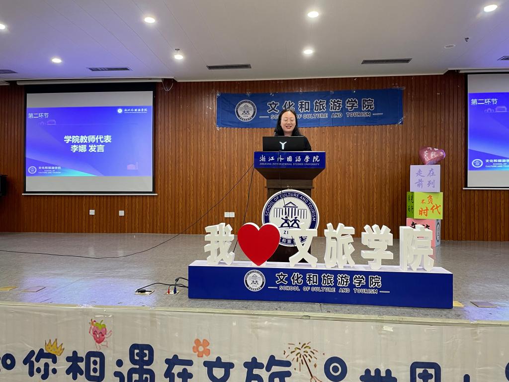 教师代表数字文旅系李娜在发言中表达了对2023级新生的欢迎和期待。李娜老师指出,塑造新型旅游业,重新思考旅游业,响应杭州建设“赛会之都”的宏大愿景,浙外文旅学子任重道远且大有可为,寄语同学们珍惜大学时光,勇敢面对挑战,努力学习面向未来的知识和技能。