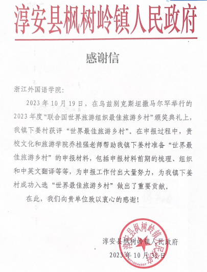 10月19日,在乌兹别克斯坦撒马尔罕举行的2023年度“联合国世界旅游组织最佳旅游乡村”颁奖典礼上,我省淳安县下姜村获评“世界最佳旅游乡村”。淳安县枫树岭镇人民政府发来感谢信,对我校澳门六合彩跑狗图 国际文旅系乔桂强老师在申报过程中提供的帮助与指导表示感谢。