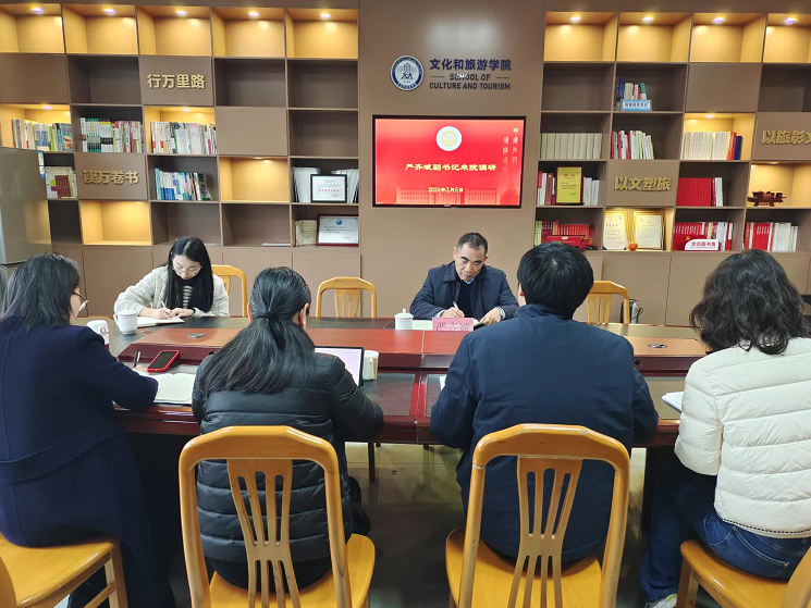 严书记和学院领导班子亲切交谈。他认真听取了班子的工作汇报,从大运河研究、乡村振兴、人才引育、党建统领、党风廉政等方面对学院发展提出了要求。他希望学院扎实开展各项工作,注重创新,高质量推动“十四五”指标落地,为学校建设国际知名以服务新型国际关系为特色的外语名校贡献文旅力量。